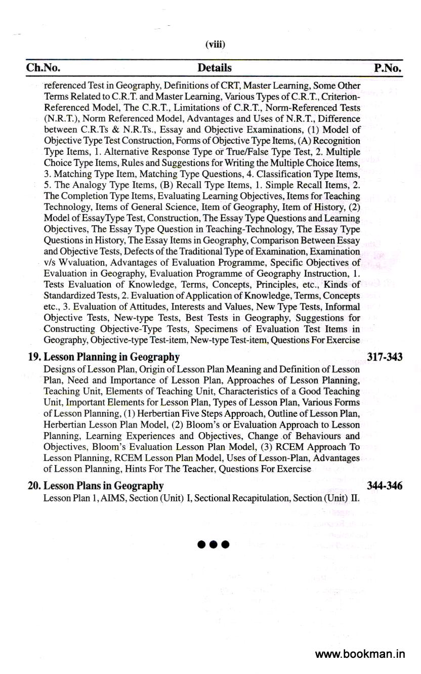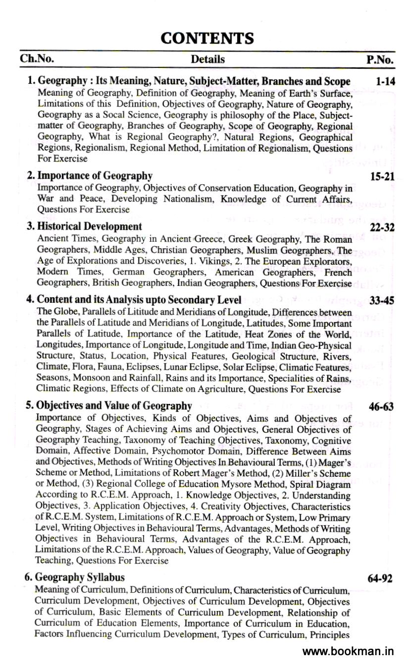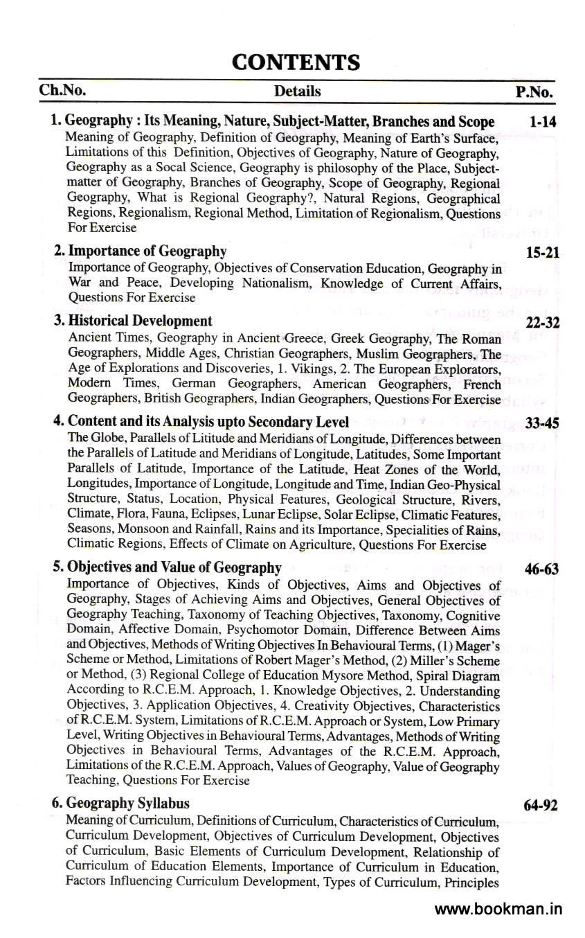 Beginning with the narration of the Historical Development of Geography teaching and ending with Lesson Plans in Geography for the guidance of future teachers. This book contains chapters on Meaning, Nature, subject matter, Branches and Scope of Geography, Importance of Geography; Content and its analysis up to the Secondary level; Objectives and value of Geography, Geography syllabus; Methods of Teaching Geography; Audio-Visual Aids; Geography Room; Geography Museum; Geography Club, Utilizing Current Events in Geography Teaching; Utilizing Library Resources; International Understanding through Geography; Geography Text- Book; The Geography Teacher, Correlation with other Subjets; Evaluation in Geography; New Type Tests and Lesson Planning in Geography.